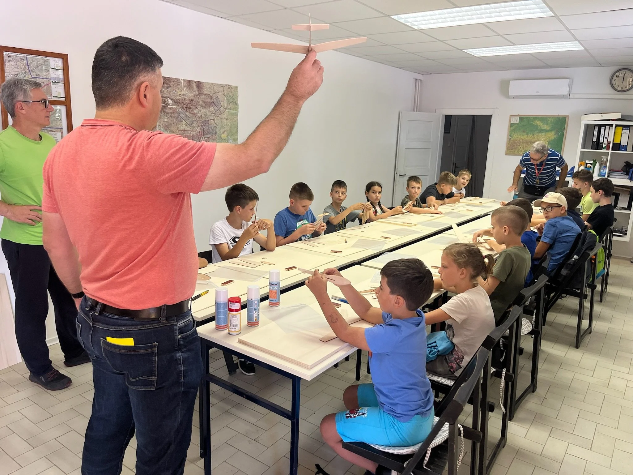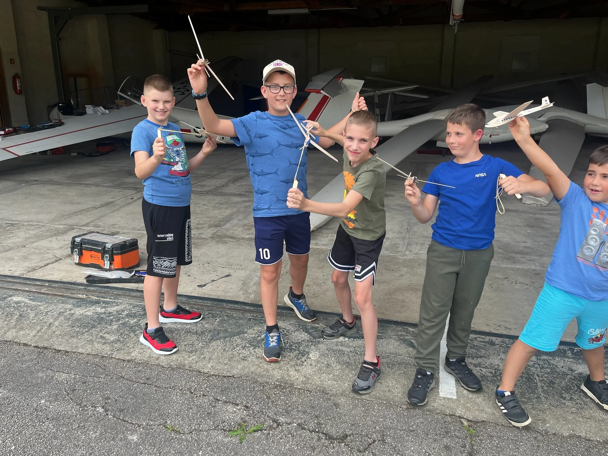 Otroci so najprej obrusili sestavne dele pod vodstvom mentorjev, nato pa so pri sestavljanju in uravnoteženju modelov začeli spuščati modele pred hangarjem in ob začetku rulne steze. Kmalu so s pomočjo gumijaste zanke samostojno izstreljevali modele. Modeli so pristajali tudi več kot 50 metrov daleč v visoki travi ali koruzi, kar je povzročilo nekaj iskanja. Prišlo je tudi do nekaj zlomov modelov, ki so jih mentorji popravili na terenu ali v delavnici. Po štirih urah so otroci iz obeh skupin navdušeno zapustili delavnici.