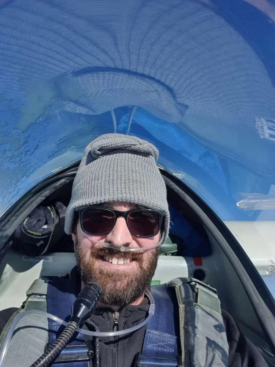 Žiga Poljanšek se je v Aeroklub Novo mesto včlanil pred štirimi leti, potem ko se je iz rodnega Kranja preselil na Dolenjsko, kjer s partnerico v Gabrju pri Soteski gradita hišo. Od nekdaj si je želel leteti, tu pa je dobil priložnost. Navdušenje je bilo tako veliko, da se ni zadovoljil le z letenjem s klubskim letalom, ampak je kupil svojega, DG 101, letnik 1978. Ima svoje podjetje, Kodi. Ukvarja se z inštalacijami, s klimatskimi napravami in toplotnimi črpalkami. Pri 38 letih ima še veliko načrtov: »V bistvu sem šele začel. Letos sem bil prvič v tujini, leteli smo na Madžarskem. Enkrat v prihodnje bi si želel tudi tekmovati, a za to potrebujem še kar nekaj izkušenj,« pravi nasmejani novi višinski rekorder.